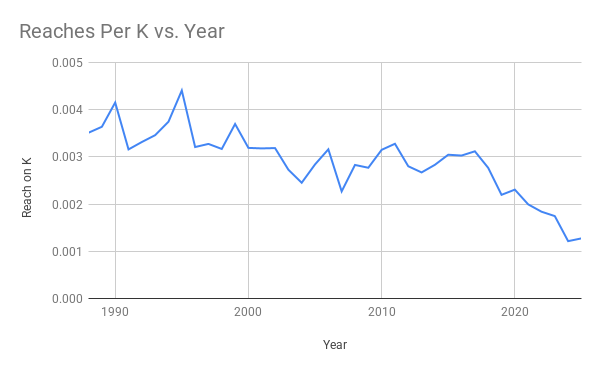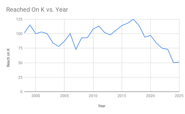 So far this year there have been almost 23,000 strikeouts across the league. Only 29 have led to the batter reaching base, which puts the league on pace for 51 this year. It’s getting rarer every year as runners decide they’ve got more important concerns than a catcher having to throw them out. Here’s the raw number of batters reaching on strikeouts every year in the 30-team era. (2020 and 2025 totals are adjusted to represent a 162-game season.)