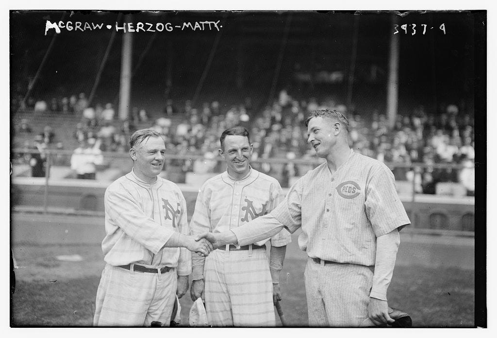 New York Giants fans had raised $1,000 to buy a landscape painting for Christy Mathewson, who had been traded two months earlier to the Reds. Mathewson, winding down his legendary career, was back in town as the Reds’ player-manager, and before the final game of the series they gave him his present.