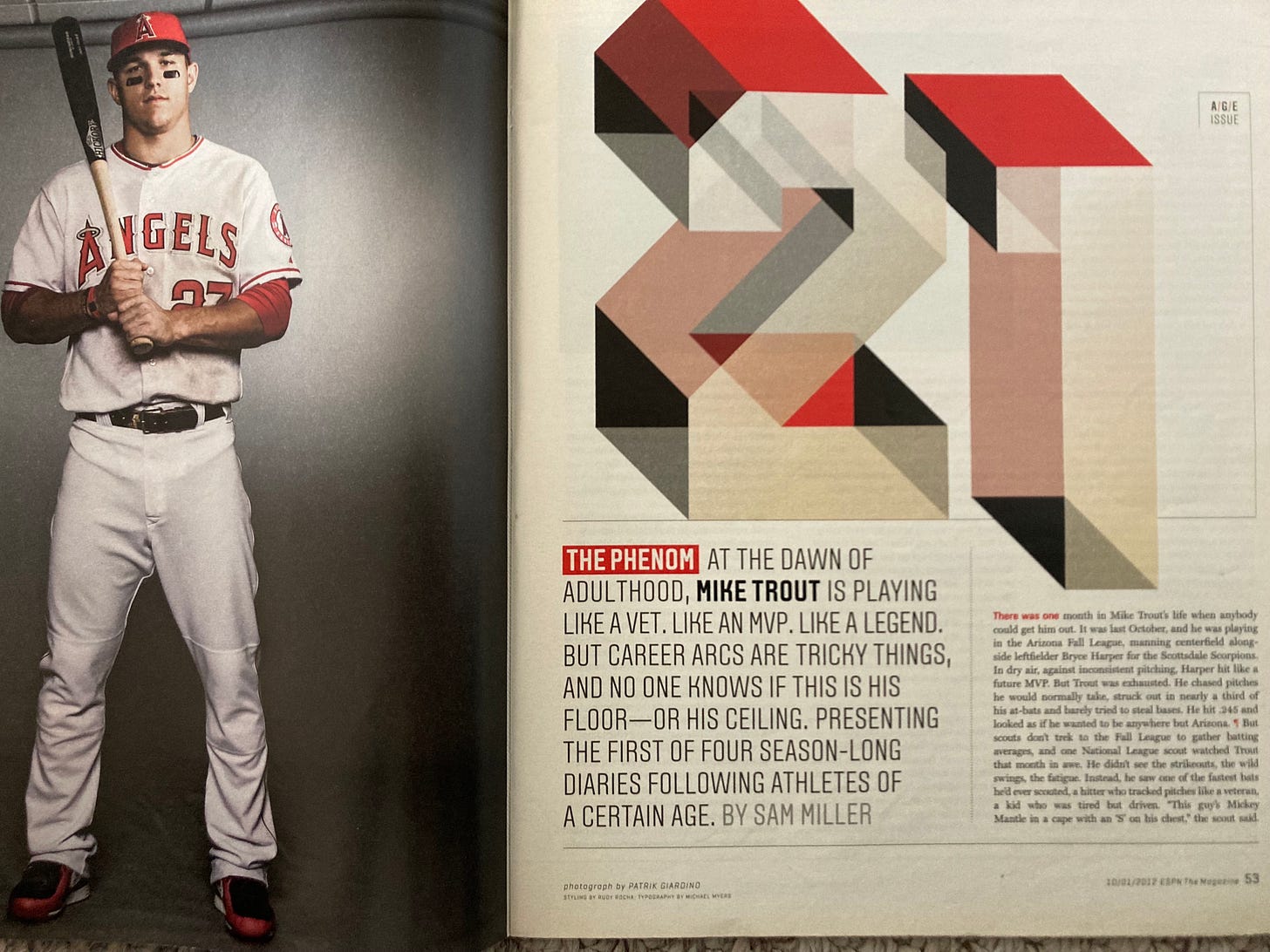 I’d get occasional eye rolls at this kind of talk; a few people I’d interview who would say it was too much, too soon. But, for the most part, everybody I spoke to was in a race to love Mike Trout the most. "I saw him down by the clubhouse,” a scout told me. “Look, I don't care about having my picture taken. But I wanted to have my picture taken with him. I haven't had my picture taken with somebody since Ted Williams.” That was a knowledgeable baseball person.